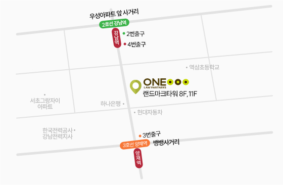 2호선 강남역 2번 출구 또는 강남역 신분당선 4번 출구로 나오셔서 같은 방향으로 600m 정도(약 10분) 걸어오시면 됩니다.